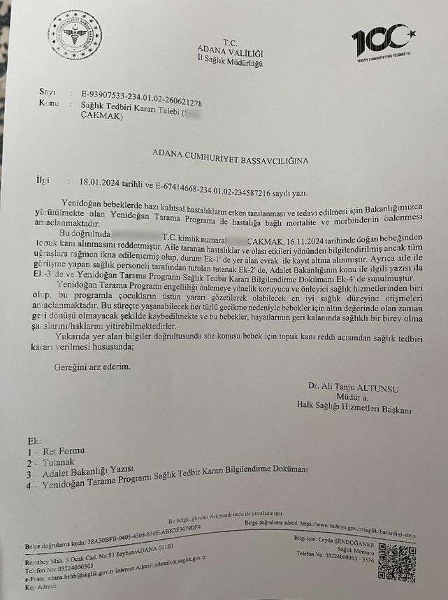 Adana’da dünyaya gelen bebekten topuk kanı aldırmayan aileye açılan dava sonucu 2.5 aylık bebeğe kayyum atandı.