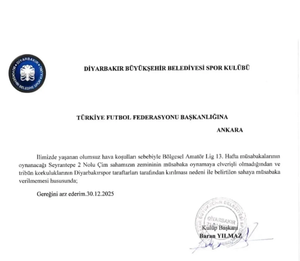 GerekçesiDiyarbakır Büyükşehir Belediyesi Spor Kulübü Başkanı Baran Yılmaz imzasıyla Türkiye Futbol Federasyonu (TFF) Başkanlığı’na gönderilen resmi yazıda, Seyrantepe 2 Nolu Çim Saha’nın maç trafiğine kapatılması talep edildi.TFF’ye sunulan dilekçede şu çarpıcı gerekçelere yer verildi: