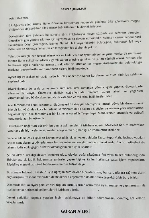 “21 Ağustos günü kızımız Narin Güran’ın kaybolması nedeniyle günlerce ülke gündemini meşgul ettiğimizden dolayı Güran ailesi olarak üzüntülerimizi bildirmek istiyoruz.